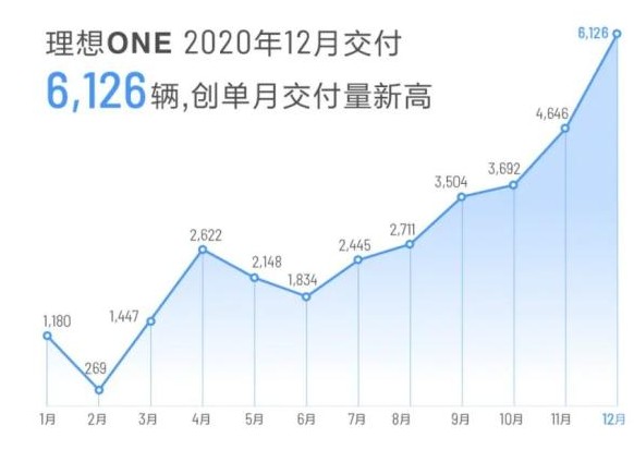 日前,理想汽车公布2020年12月份理想ONE的交付量为6126辆,相比上个月的4646辆,环比增长31.9%,且连续6个月实现环比上涨。2020年理想ONE总计交付32624辆。