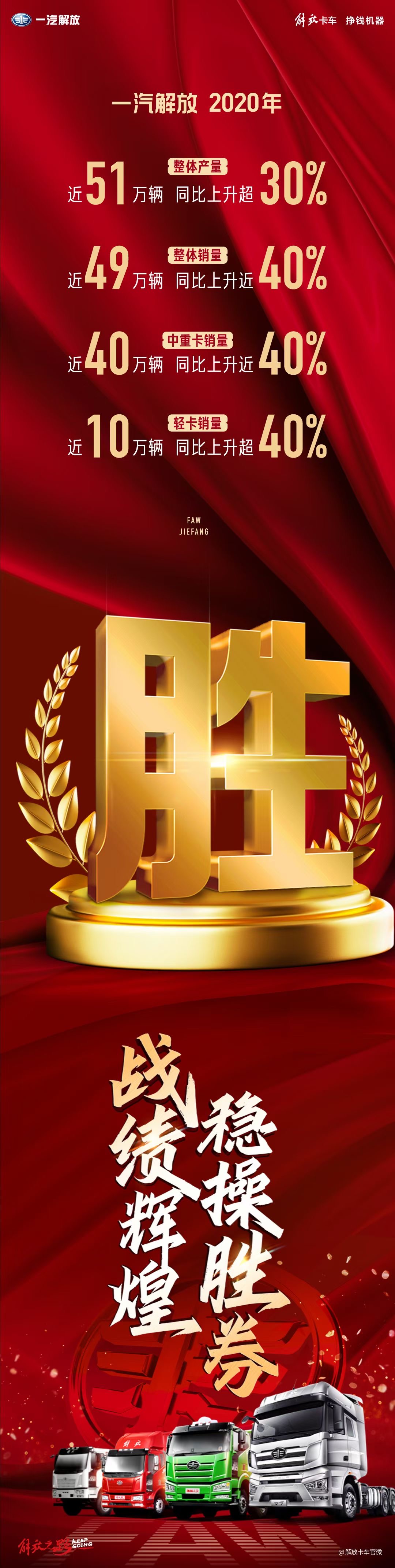 2021年1月2日,解放在其官微公布了2020年全年产销量。2020年,解放整体产量近51万辆,同比增长超过30%;整体销量近49万辆,同比增长近40%。其中,中重卡销量近40万辆,同比增长近40%;轻卡销量近10万辆,同比增长超过40%。