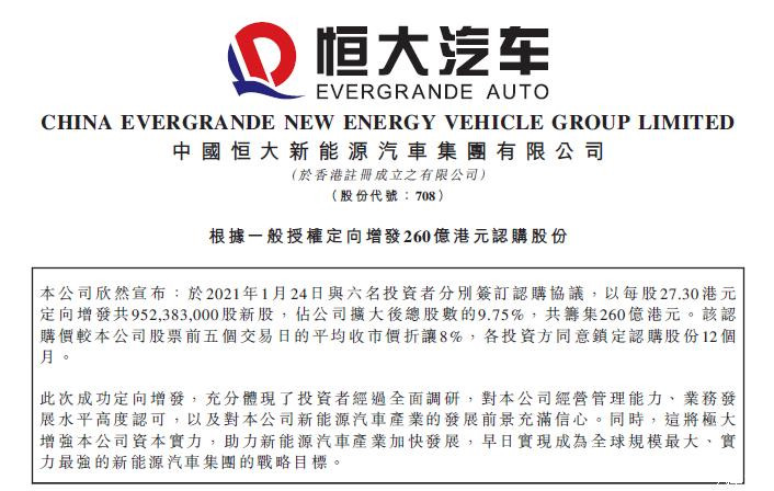 1月24日,恒大汽车(0708.HK)发布公告宣布,按前五个交易日平均收盘价折让8%的价格,向6名投资人配售9.52亿股新股,共引资260亿港元(约合217.3794亿元人民币),成为新能源汽车行业又一笔大规模股权融资。