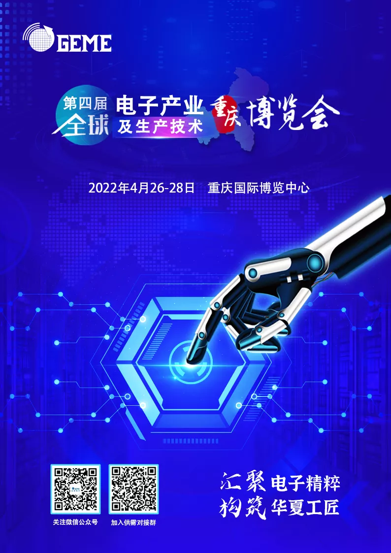 为进一步推动重庆及中西部地区电子产业高质量创新发展,发挥成渝双城经济圈产业优势,挖掘西部市场发展机遇,促进产业链深度交流合作,建设具有全国影响力的战略性新兴产业集群,由中国电子学会、中国汽车工业协会、重庆市经济和信息化委员会共同支持的第四届全球电子产业及生产技术(重庆)博览会(简称:GEME 2022),将于2022年4月26日-28日在重庆国际博览中心召开。