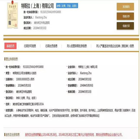 特斯拉(上海)有限公司于5月10日获上海浦东新区市场监管局核发的营业执照,特斯拉(上海)有限公司注册资本1亿元,股东为特斯拉汽车香港有限公司,公司成立日期为5月10日,经营范围:从事电动汽车及零部件、电池、储能设备、光伏产品领域内的技术开发、技术服务、技术咨询、技术转让,上述同类商品的批发、佣金代理(拍卖除外)及进出口业务,并提供相关配套服务,电动汽车展示及产品推广。