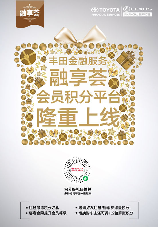 丰田金融服务融享荟会员积分平台包括:会员专享权益、积分福利及更多增值服务,如原厂汽车精品、消费类卡券,经销店消费券、维修保养抵扣券、违约金免除等。平台根据用户合同金额划分用户专属等级,随着等级的提升,不同的权益、积分兑换等多项福利和优惠也会不断升级。为每一位用户送出福利,让每一笔交易都能积累成长,从而实现以积分服务用户、以权益回馈用户的良好循环,通过最大化发挥用心服务用户的行动。