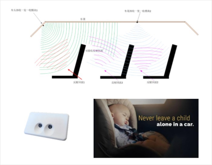 为有效探测车内活动物体,儿童遗忘系统超声波探测器装于车顶部,当锁车后触发开始工作,向下发送40KHz超声波(对人体无害)。当有活动物体经过工作区域将会造成探测物体距离发生变化,亦即超声波回波发生变化,从而判定车内存在活动的物体,继而触发报警。