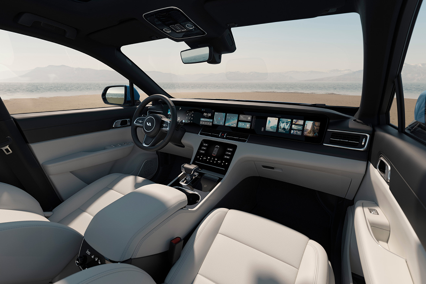 内饰采用简约的设计风格,空调出风口贯穿了全液晶仪表盘和中控屏一直延伸到副驾位置,让中控台看起来更有层次感,内饰的做工用料也很有档次,并且还提供女王副驾的选装。NOMI车载人工智能系统是其一大亮点,它可以识别语音指令来启动车辆各项功能,并且还能进行互动式的交流。
