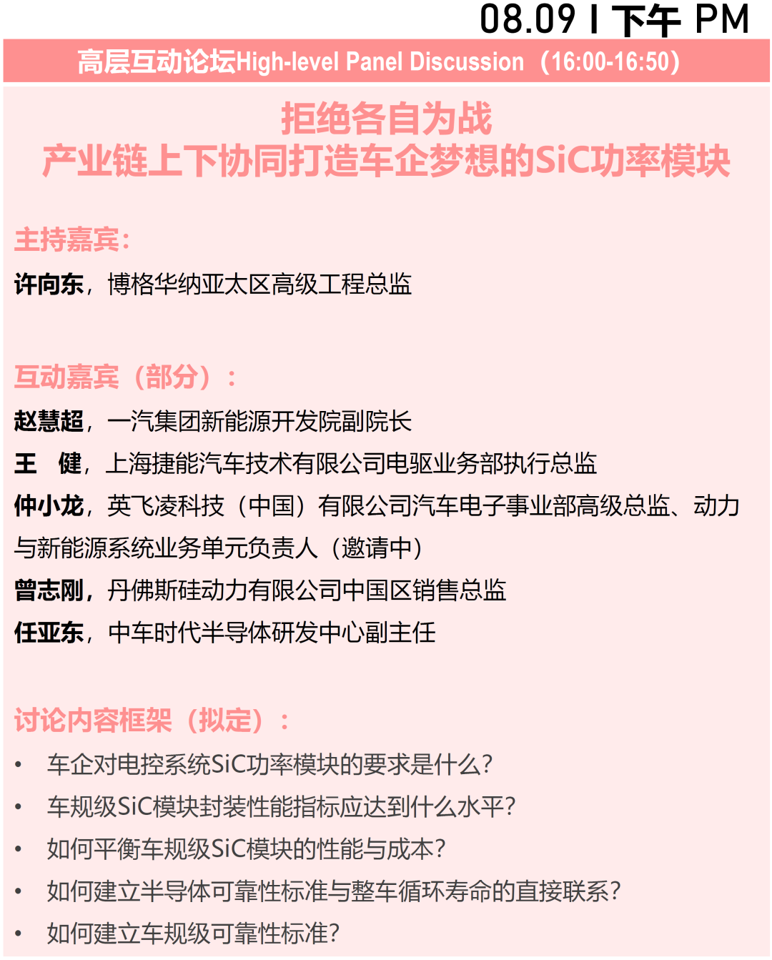 期待通过创新技术和发展趋势的研讨,能够就什么是车规级SiC模块封装达成行业共识,促进产业链上下游协同创新,为探索封装技术的创新方向提供高价值的参考。