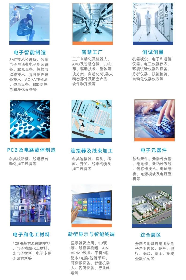 本届展会贯通产业链创新链服务链,形成全链汇聚的新优势,全国知名企业将集中展示,展出范围覆盖9大主题领域——电⼦智能制造、智慧⼯⼚、测试测量、PCB及电路载体制造、连接器及线束加⼯、电子元器件、电子和化工材料、新型显示与智能终端、综合展区。