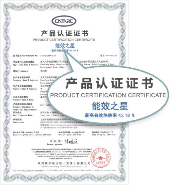 【东风全新马赫1.5T混动发动机及“能效之星”产品认证证书】