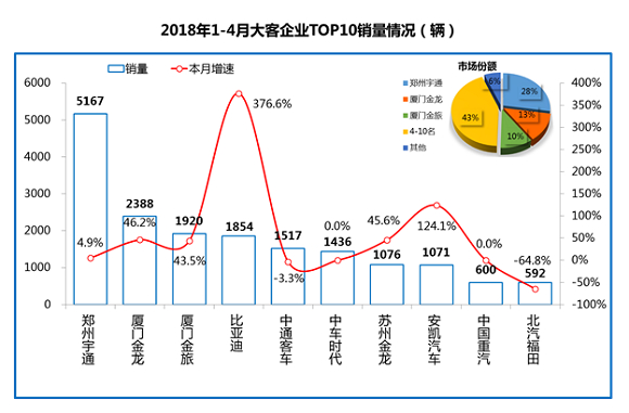2018年1-4月,大型客车产销分别为2.0万辆和1.9万辆,同比分别增长34.99%和31.60%。前十名企业销量排名中,郑州宇通销量排名第一,共销售5167辆,同比累计增长4.9%;比亚迪表现良好,累计增长376.6%。