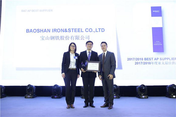 宝山钢铁股份有限公司获得本特勒“2017/2018 最佳供应商奖”(图中人物从左到右:本特勒汽车全球采购副总裁 Barbara Buttinger;宝山钢铁股份有限公司周铭;本特勒汽车亚太执行副总裁施宏)