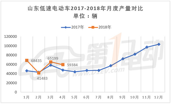 据山东省汽车行业协会统计,2018年4月山东生产低速电动车59384辆,同比去年4月的47848辆增长24.1%。2017年市场和政策双重狙击力度在2018年减弱后,低速电动车市场再次破冰且高歌猛进。