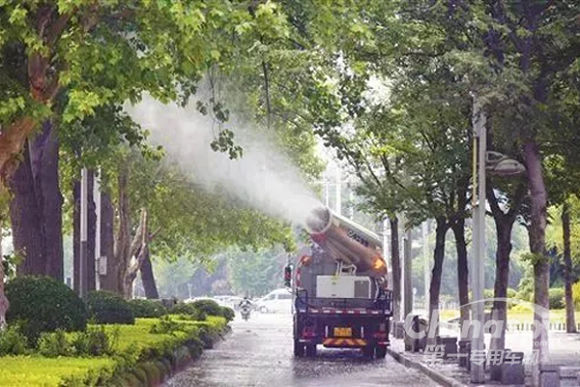 2018年5月25日获悉,在徐州市黄河西路,一辆徐工雾炮车正在对行道树喷射水雾进行“降絮”作业,减少杨柳絮“骚扰”。