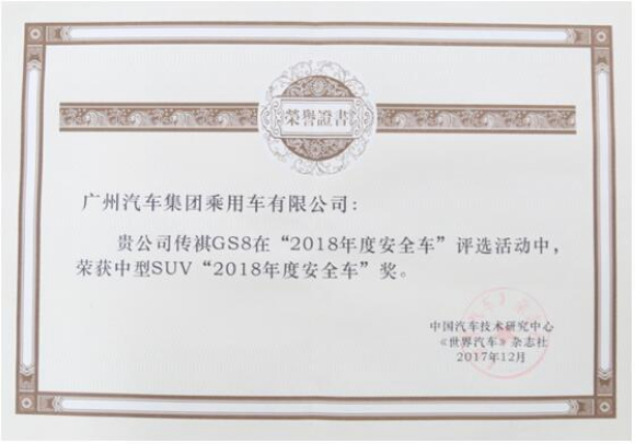 随着国内消费市场不断升级,消费者买车更加注重以安全、性能等为代表的“好车”标准。传祺GS8承袭传祺在安全品质上的历史优势,此次荣获“2018年度安全车”奖项实至名归。相信在广汽传祺对产品品质的严苛追求下,必能凭借高品质不断征服市场,为中国乃至全球消费者带来更优质安全的产品体验,助力中国汽车业发展壮大,引领中国品牌迈向更高的台阶。