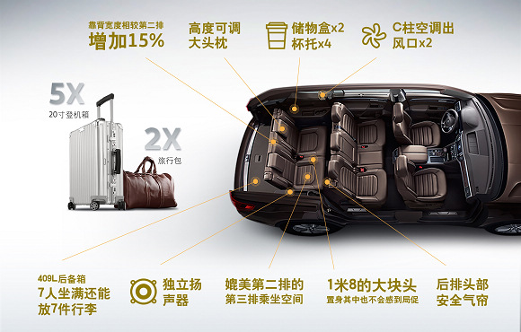 值得一提的是,途昂并没有为了营造舒适的乘坐空间而牺牲后备厢的储物空间。当车内坐满7人时,途昂仍有409L的后备厢储物空间,可同时容纳5个20吋行李箱与2个随身背包,进一步显示出真7座SUV的强悍实力。