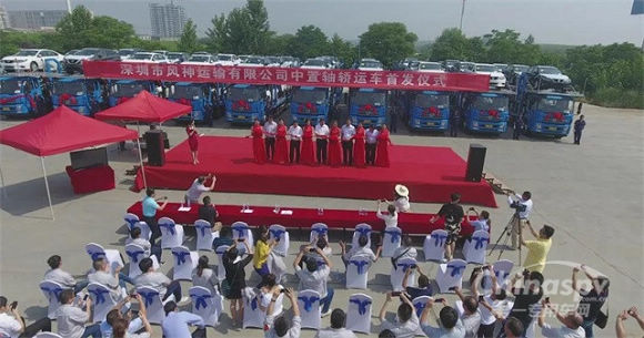 6月1日,东风车城物流股份有限公司首批106辆东风天锦中置轴轿运车满载848辆东风日产、东风英菲尼迪品牌乘用车(每辆轿运车装载8辆轿车),从襄阳物流基地出发,发往东风日产和东风英菲尼迪广东、山东的经销商。