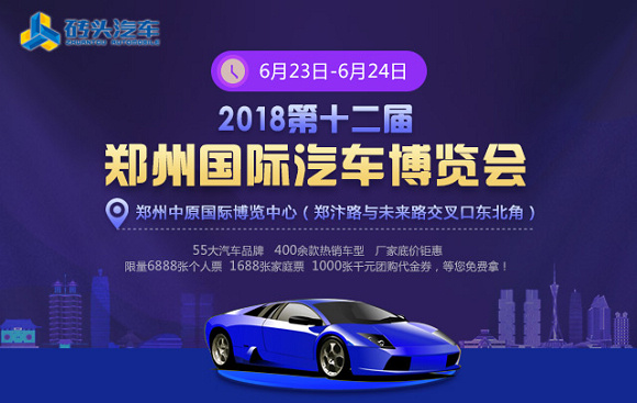 2018第十二届郑州国际汽车博览会,将于6月23日至6月24日在郑州中原国际博览中心举行,展会为期2天,每天9:00-18:00。