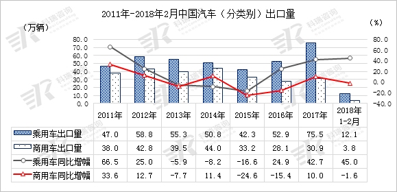 由于全球经济持续复苏,国际市场需求回暖,推动我国汽车出口规模持续增长。根据海关统计,2017年累计出口各类汽车106.3万辆,同比增长31.3%,延续了去年的快速增长趋势,今年我国累计出口汽车16.0万辆,同比增长30.2%,市场开局良好。