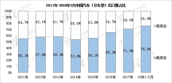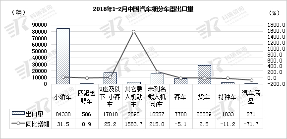 从细分市场来看,1-2月乘用车出口形势要好于商用车,累计销售45.0万辆,同比增幅达45.0%,商用车出现微弱下滑,同比下滑1.6%。