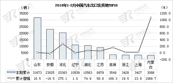 出口量最高的3个省份为山东、安徽和河北,出口量分别为31673辆、23025辆和20383辆,占汽车出口总量的47.0%;出口量TOP省份中,内蒙古、河北和吉林增幅较高,同比增幅分别为1069.7%、275.1%和169.3%。