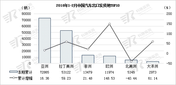 除北美洲市场下滑40.44%外,其他市场均实现不同程度增长,其中欧洲市场销量增幅最高,同比增长了148.53%,累计销售11974辆;亚洲和拉丁美洲依旧是我国汽车出口的主要地区,1-2月出口量分别为72865辆和53122辆,同比增幅分别为16.36%和59.23%。