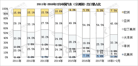 北美洲占比在2016年达到最高的7.0%后,近三年占比逐年下滑。2018年随着中美贸易战的爆发和逐渐升级,对我国开拓美国市场将造成较大的负面影响,不过由于我国汽车出口仍主要集中在发展中国家,欧美等发达国家出口占比较小,因此对我国汽车整体出口影响不大。对于计划发展和开拓美国市场的中国车企来说,目前应谨慎进入美国市场,避免成为中美贸易战过程中的靶标。