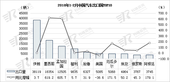 伊朗是我国汽车出口的最大市场,2018年1-2月我国对伊朗出口汽车38119辆,同比增长3.7%,占汽车出口总量的23.9%;墨西哥和孟加拉国分列第二、三名,累计出口量分别为18354辆和12505辆,同比均实现爆发式增长,增幅分别为619.2%和605.7%;TOP10国家中,美国是唯一一个出口下滑的国家,累计出口5085辆,同比下滑38.6%。