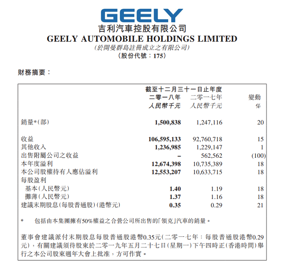吉利汽车发布2018年业绩公告 全年利润达126.7亿元