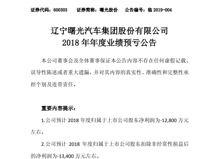 1月30日,辽宁曙光汽车集团股份有限公司(下称“公司”)发布2018年年度业绩预亏公告。公司预计2018 年度归属于上市公司股东净利润为-12,800万元左右。公司预计2018年度归属于上市公司股东扣除非经常性损益后的净利润为-13,400万元左右。 [详细]