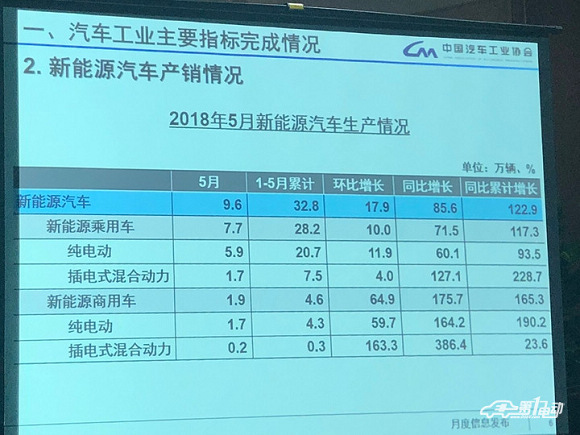 6月11日,中汽协发布2018年5月份汽车产销数据。新能源汽车部分,5月份产销量分别为10.2万辆和9.6万辆,同比增长分别为85.6%和125.6%。