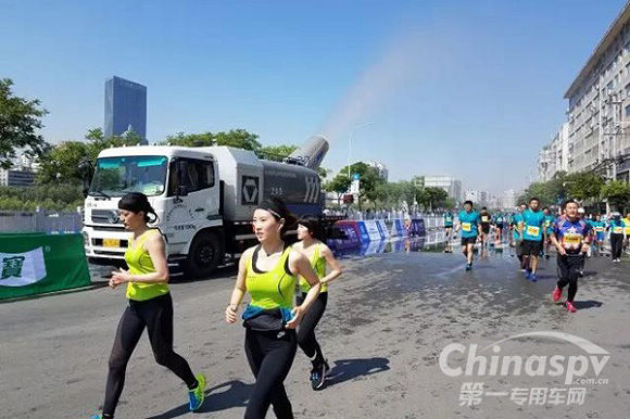 徐工雾炮车是通过高压将自来水雾化成与粉尘大小相当的颗粒,在风机作用下,将水雾定向抛射到指定位置,在尘源处的上方或周边进行喷雾覆盖。粉尘颗粒与雾滴接触后变得湿润,被湿润的粉尘颗粒继续吸附其他粉尘颗粒,逐渐组成颗粒团,在自身重力作用下沉降到地面,从而达到除尘抑尘的目的。另外,兰州地处黄土高原,紫外线强烈,尤其比赛进行至中午时温度较高,雾炮车也作为降温神器,为跑者们提供服务,所到之处,空气清新、路面湿润。