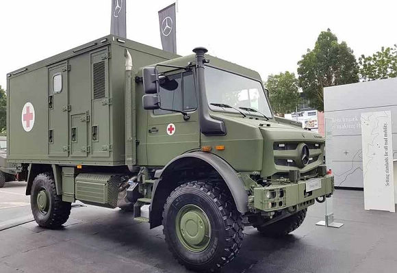 该安普全地形军用救护车采用梅赛德斯-奔驰乌尼莫克U4023底盘,欧6排放标准。安普公司设计生产的车辆上装,运用救援科学及人体工程的原理,最大限度提高救援人员的作业效率,完成为生命护航的艰巨使命。