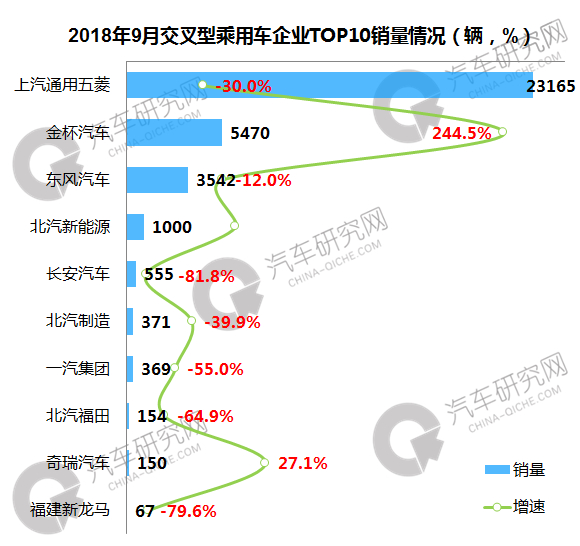 10月交叉型乘用车企业中,上汽通用五菱位居第一,共计销售22281辆,同比增长7.0%;前十企业中,金杯汽车增幅较大,增速达到27.4%,东风汽车增速为1.4%,仅此3家企业实现正增长,其他企业均出现不同程度下滑或持平。 [详细]