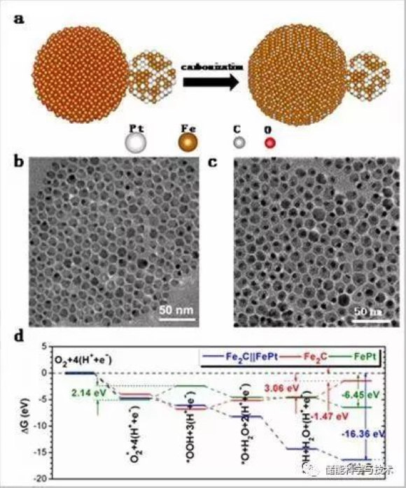 图1.a)合成示意图;b)PtFe-Fe3O4纳米粒子;c)PtFe-Fe2C纳米粒子;d)DFT计算