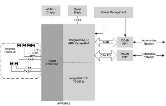 2. AWR1642整合了C674x数字信号处理器及ARM Cortex-R4F,用于管控通信。