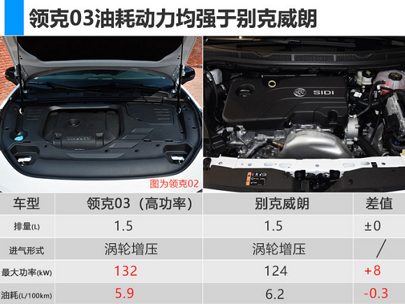 领克03搭载一台来自沃尔沃的1.5L涡轮增压发动机,分为高低功率两个版本,高功率版本最大功率132kW,低功率版本最大功率115kW,传动系统或将匹配6速手动变速箱和7速湿式双离合变速箱。其中高功率版本油耗为5.9L/100km、低功率版本油耗为5.5L/100km。