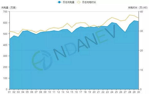 从日总充电量和充电时长来看,4月份新能源汽车日总充电量在400-600万度之间,日总充电时长在30-40万小时(如图2所示),充电量和充电时长较3月份均有大幅度提高。同时,结合充电量和充电时长曲线,可以看出总充电量变化与充电时长变化曲线较为一致,具有正相关性,这表明慢充是当下新能源汽车充电的主要形式,偶尔才会出现快充集中现象。