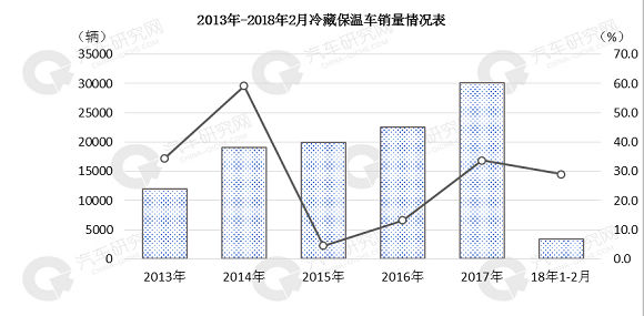 冷藏保温车销量逐年增长,由2013年的11952辆到2017年的30121辆,可以看出冷藏保温车市场需求较高。2018年1-2月冷藏保温车销售3475辆,同比增长29%。