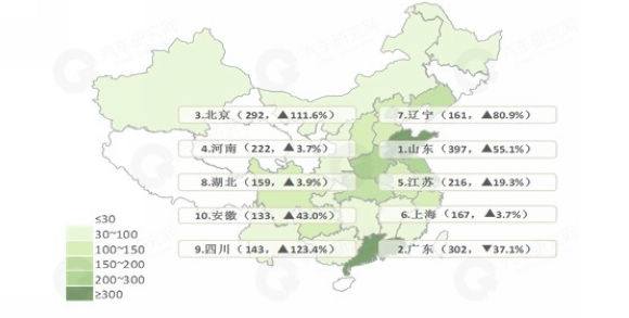 山东、广东、北京、河南和江苏销量位列前五。前十企业仅有广东呈现下降趋势,其中北京和四川成倍增长。