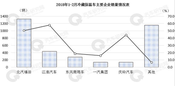 北汽福田销量为1327辆,增幅为50.5%。前五其他企业均呈现增长趋势;总体看,冷藏保温车市场表现良好。