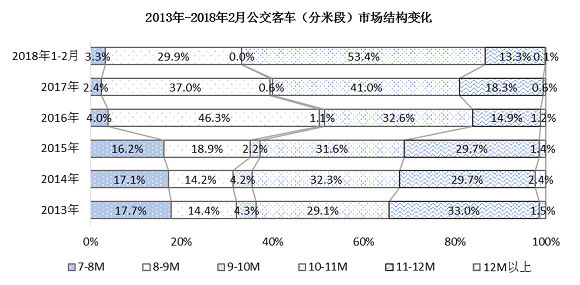 从各米段销量分布来看,2018年1-2月,8-9米和10-11米客车是公交客车最主要市场,分别占客车市场的29.9%和53.4%,其次11-12米占比达到13.3%;其他米段市场占比较小,市场占比均不足5%;农村公交以及新能源客车成为驱动8-9米和10-12米客车市场占比提升的主要因素。