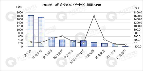 分企业看,比亚迪以绝对优势销量排名第一,累计销售1832辆,同比增长72.2%,郑州宇通和北汽福田分列第二和第三名,前十企业除厦门金龙和广通客车同比下滑外,其他企业全部实现较大幅度增长。