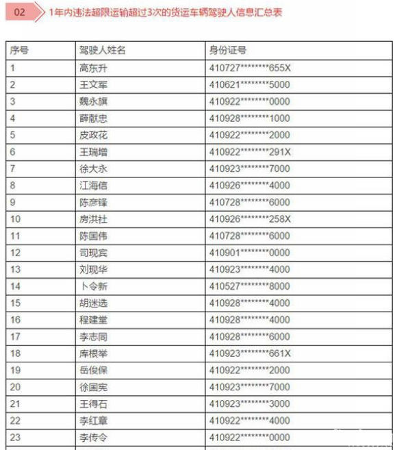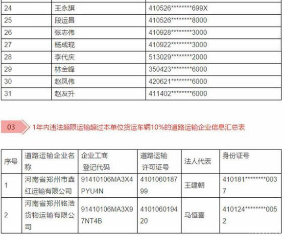 2017年6月28日,根据国家发展改革委、中国人民银行、交通运输部等36个部门联合签署的《关于对严重违法失信超限超载运输车辆相关责任主体实施联合惩戒的合作备忘录》,现对交通运输部门公布的严重违法超限超载失信当事人信息予以公布。