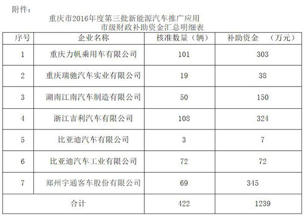 近日,重庆市经信委发布《关于2016年度第三批新能源汽车推广应用市级财政补助资金的公示》,浙江吉利汽车有限公司等7家新能源汽车生产企业在重庆市推广应用的422辆新能源汽车满足市级财政资金补助要求,涉及市级财政补助资金1239万元。