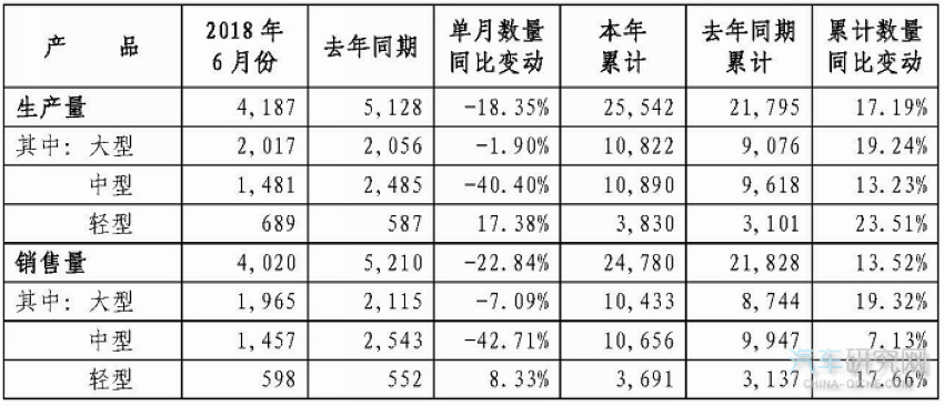 7月4日,郑州宇通客车股份有限公司发布2018年6月产销快报。数据显示上半年累计产量为25542辆,产量累计同比增长17.19%;上半年累计销量为24780辆,累计同比增加13.52%。大型客车上半年累计产量为10822辆,累计同比增长19.24%;上半年累计销量为10433辆,累计同比增长19.32%。中型客车上半年累计产量为10890辆,累计同比增长13.23%;上半年累计销量为10565辆,累计同比增长7.13%。轻型客车上半年累计产量为3830辆,累计同比增长23.51%;上半年累计销量为3619辆,累计同比增长17.66%。