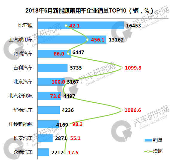 6月新能源乘用车销售7.4万辆,同比增长87.9%,其中比亚迪排名第一,超过1.6万辆,上汽乘用车位列第二,销量为1.3万辆,其他企业单月销量均在万辆以下;前十企业中,吉利和华泰汽车增幅较大,均超过1000%。
