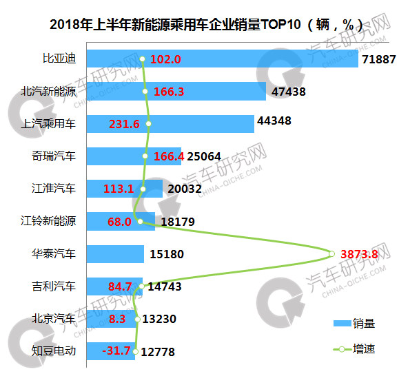 上半年新能源乘用车累计销售35.5万辆,同比累计增长129.6%,市场表现良好。前十企业中,比亚迪遥遥领先,上半年累计销售7.2万辆,同比增长102.0%,北汽新能源和上汽乘用车位于第二集团,销量均在4万辆以上;前十企业中,华泰汽车增速最大,增幅接近4000%。
