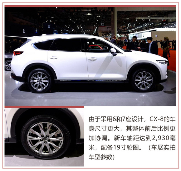 马自达CX-8长宽高分别为4,900*1,930*1,840毫米,轴距达到2,930毫米,相比于CX-5车身整体均有所增加,使得车内拥有更加充裕的空间,同时接近5米的车身长度也让新车侧面造型更加的大气。此外,新车的轮圈采用了双五辐式造型,整体看上去也更加的运动。