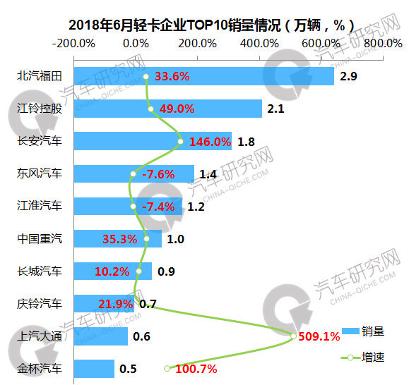 6月轻卡企业中,北汽福田位居第一,销量达到2.9万辆,同比增长33.6%,前十企业中,东风和江淮是仅有的两家销量下滑企业;上汽大通当月销量增速超过500%。