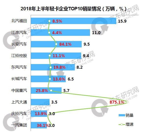 上半年轻卡企业中,北汽福田位居第一,销量达到15.9万辆,同比增长8.5%,江淮汽车排名次席,累计销售11万辆,同比微增4.4%;前十企业中,上汽大通增幅最大,累计增长875.1%。