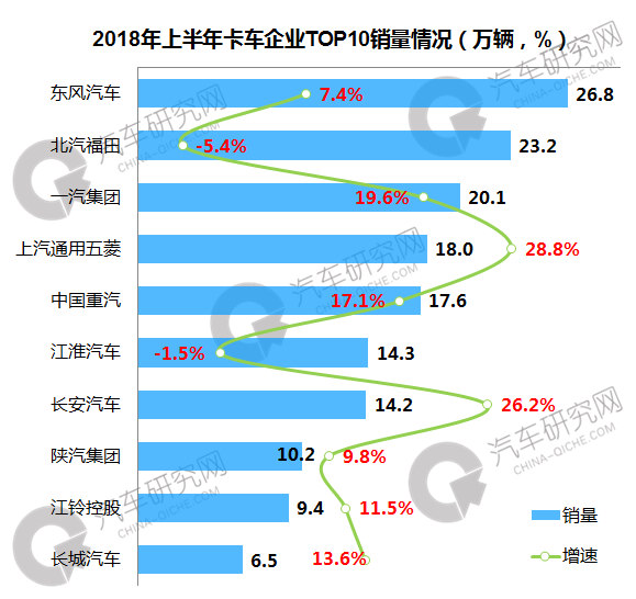 上半年卡车企业中,东风汽车位居第一,销量达到26.8万辆,同比增长7.4%;北汽福田紧随其后,销量达到23.2万辆,同比下降5.4%;前十企业中,上汽通用五菱和长安汽车增幅均超过20%;除北汽福田和江淮汽车外,其他企业均实现不同程度的增长。