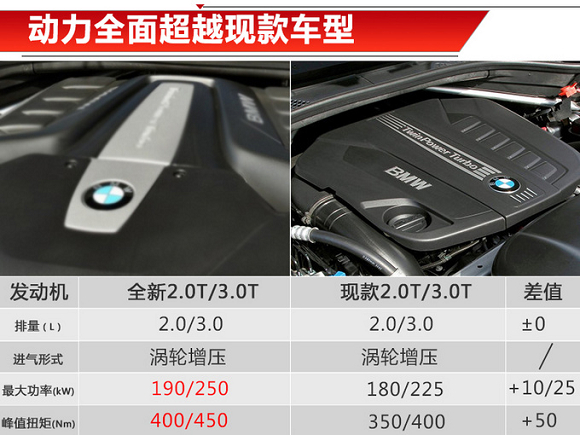 动力方面,宝马全新X5有望搭载全新的2.0T四缸与3.0T(代号为B58)直列六缸发动机,最大功率分别为190kW与250kW,峰值扭矩分别为400Nm与450Nm,动力相比现款车型全面升级。新车传动系统预计将匹配8速手自一体变速箱,且全系标配xDrive全时四驱系统。
